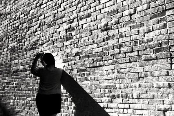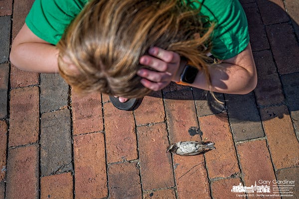 In the quiet hours of an ordinary day, a child kneels on a brick path, their head bent low, hands pressed to their temples in disbelief or grief.