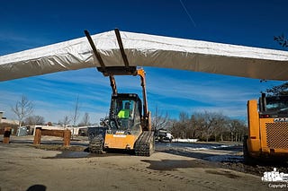 This photograph of a construction scene, showing a large wrapped beam held aloft by machinery, is an excellent example of turning an ordinary moment…