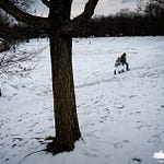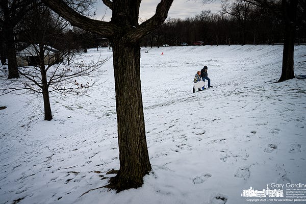 This photo of a father and daughter climbing a snowy hill teaches photographers how to move past dramatic shots and focus on quiet storytelling.