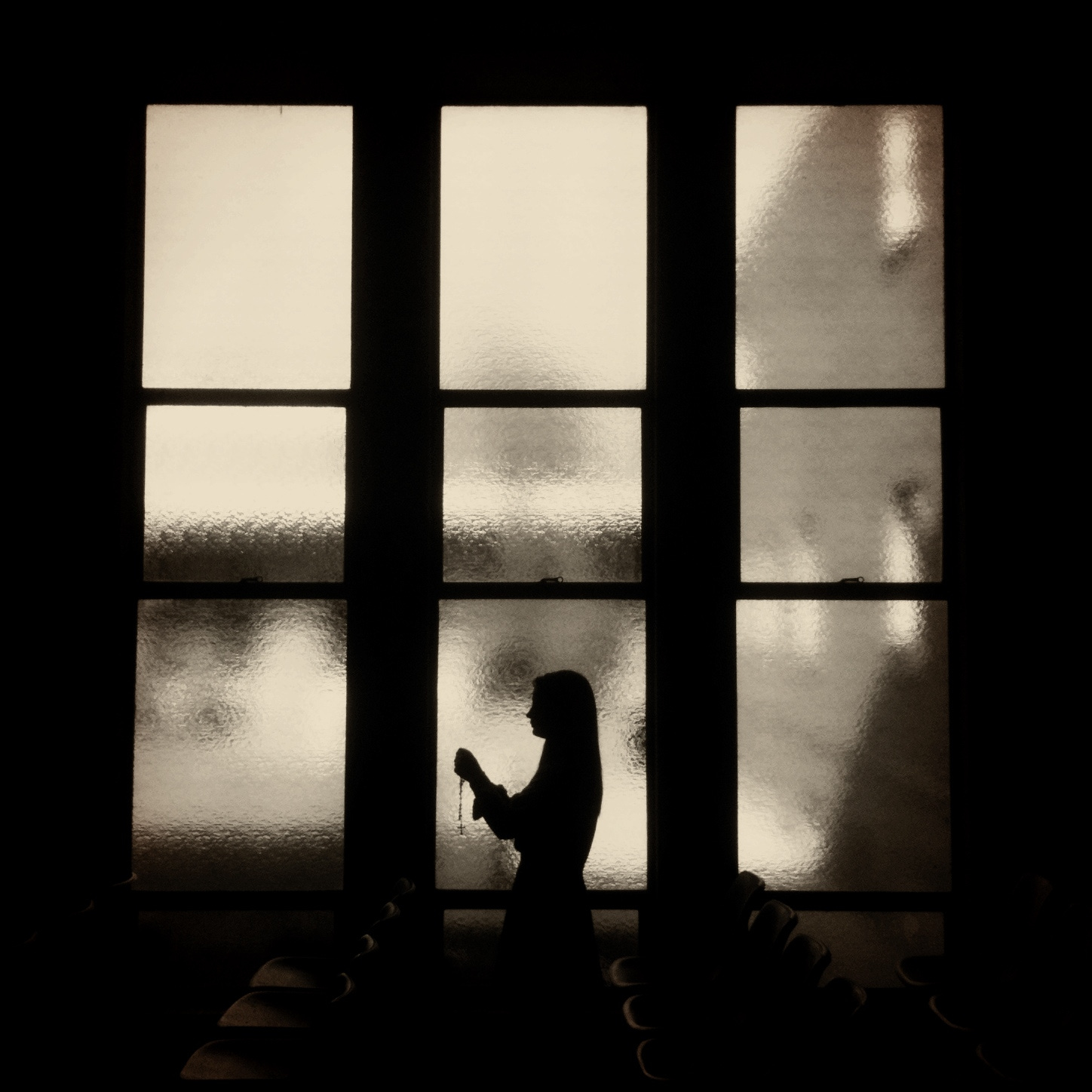 At first glance, the frame seems simple. A single dark figure stands in profile, hands raised, possibly holding beads or a small object, while large window panes glow softly behind her. The glass obscures everything beyond it, turning the outside world into blurred light and vague shapes. That lack of clarity is exactly what gives the photograph its emotional power. We are not told everything, so we linger longer with the image.