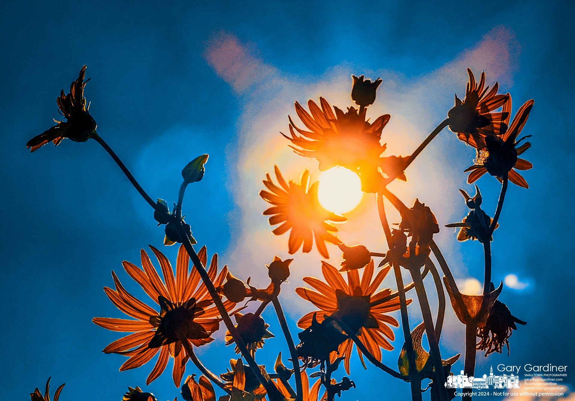 Backlit by the sun, the flowers stand as bold, dark silhouettes against the sky, their edges softly glowing with light. This technique highlights the intricate details of the petals and infuses the flowers with a sense of mystery and grandeur. They stretch upwards, reaching for the sun—an embodiment of aspiration and growth.