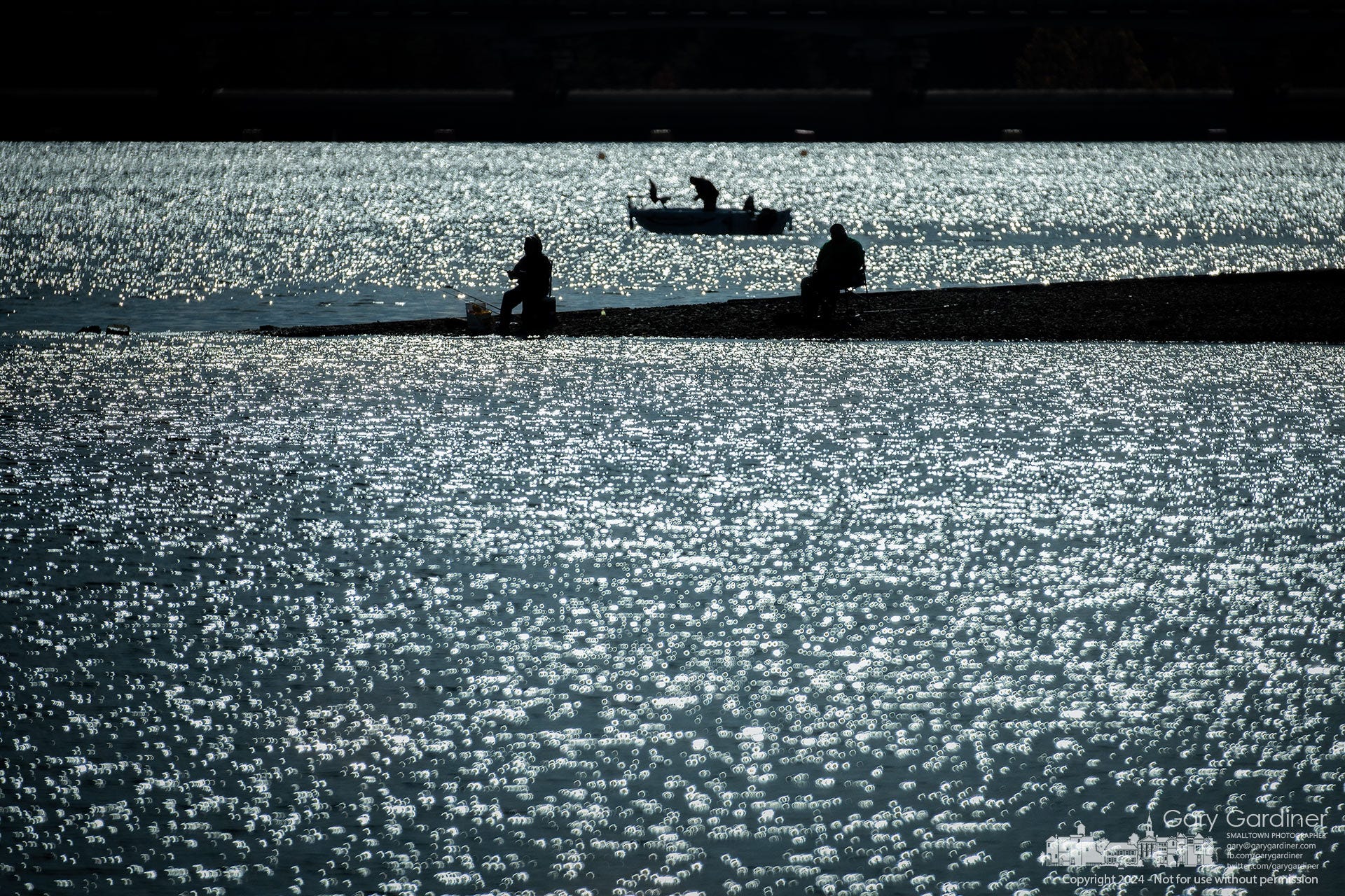 This photograph captures a quiet, reflective moment on Hoover Reservoir. A few silhouetted figures fish in stillness while sunlight scatters across the water’s surface. The contrast between dark shapes and shimmering highlights creates a strong visual rhythm and a feeling of calm isolation.