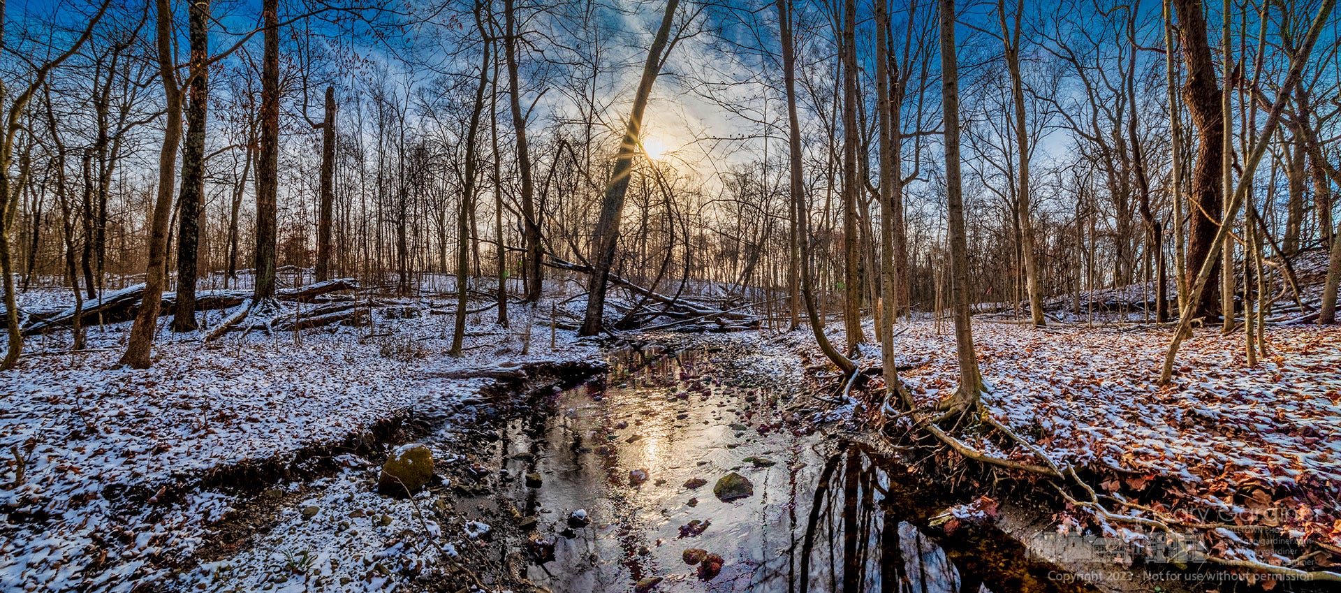 The HDR panorama was the only way to hold both the highlights in the sunlit section at right and the other side of the creek in a darker shadow. Plus keeping the sun from being overexposed. Fortunately, the sun was behind a thin cloud that helped hold the highlight by diffusing the direct light.