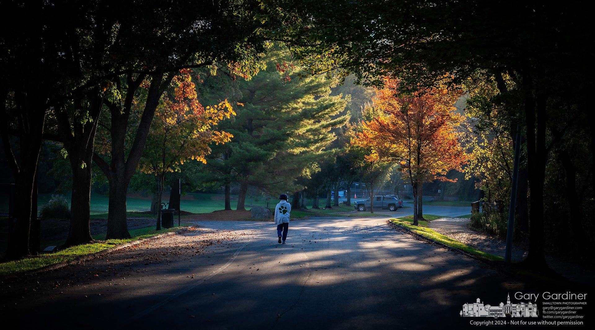 Photographers often talk about chasing dramatic subjects, but images like this remind us that a familiar road can become remarkable when light and timing come together. This photograph of a lone walker on a tree-lined street succeeds not because the subject is rare, but because the photographer captures the moment when ordinary space turns luminous.