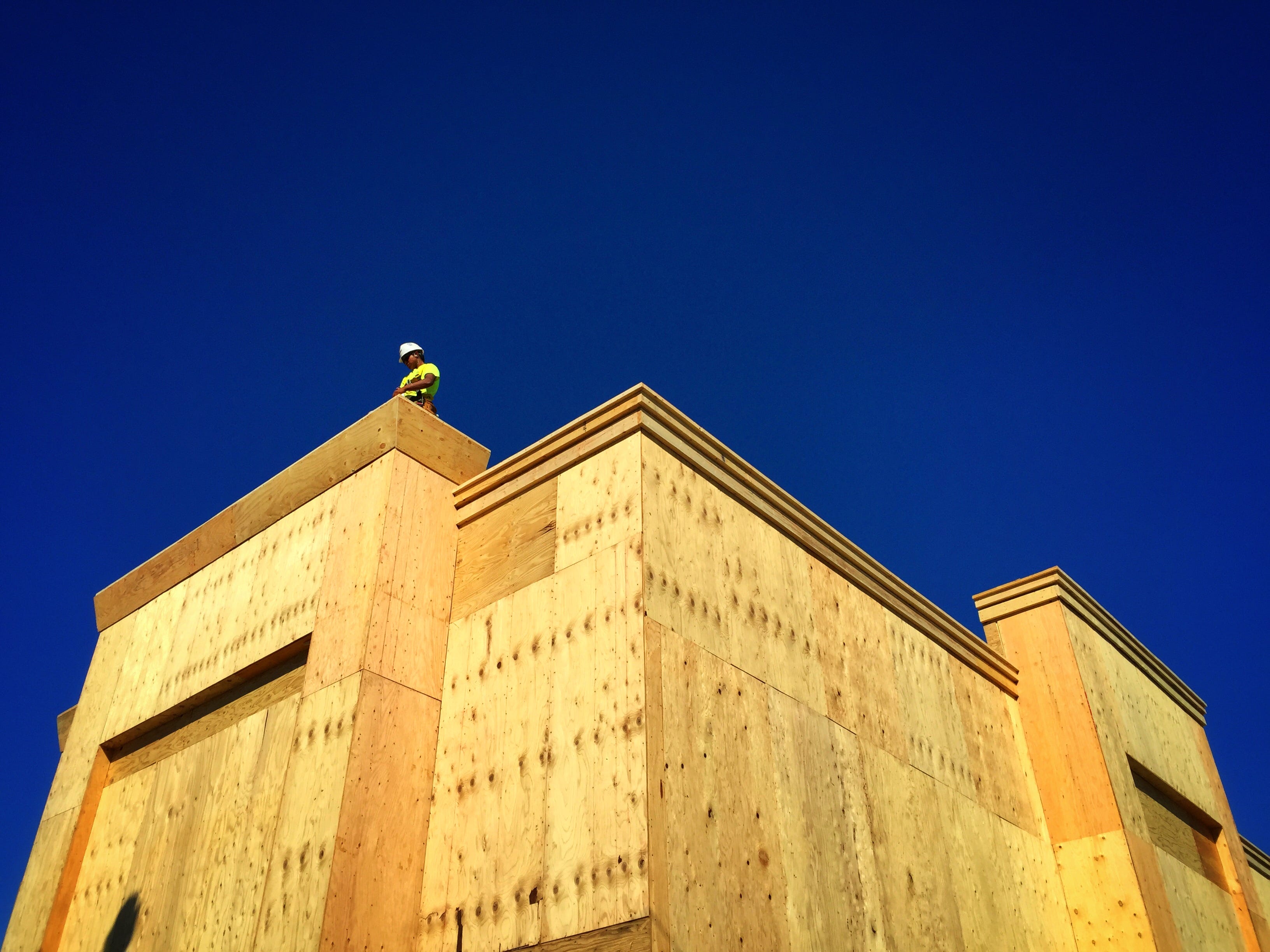 What makes the frame hold is the angle. From below, an unfinished building stops reading as ordinary construction and starts to feel monumental. Raw plywood, hard edges, and the sharp corner pushing into the sky turn the structure into something graphic and severe. It becomes less a record of a job site than a study in mass, geometry, and proportion.